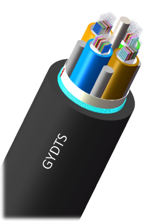 A estrutura do cabo óptico consiste em inserir fita de fibra óptica de modo único ou multi-modo num tubo solto feito de plástico de alto módulo cheio de composto à prova d'água.O centro do núcleo do cabo é uma parte de reforço de metalPara alguns cabos ópticos com determinados números de núcleos, uma camada de almofada de polietileno é extrudida para fora da parte central de reforço metálico.Tubos soltos (e cordas de enchimento) são torcidos em torno do membro central de reforço para formar um núcleo de cabo compacto e redondoAs lacunas no interior do núcleo do cabo são preenchidas com um composto que bloqueia a água e, em seguida, uma bainha ligada a polietileno e aço é extrudida para formar o cabo.