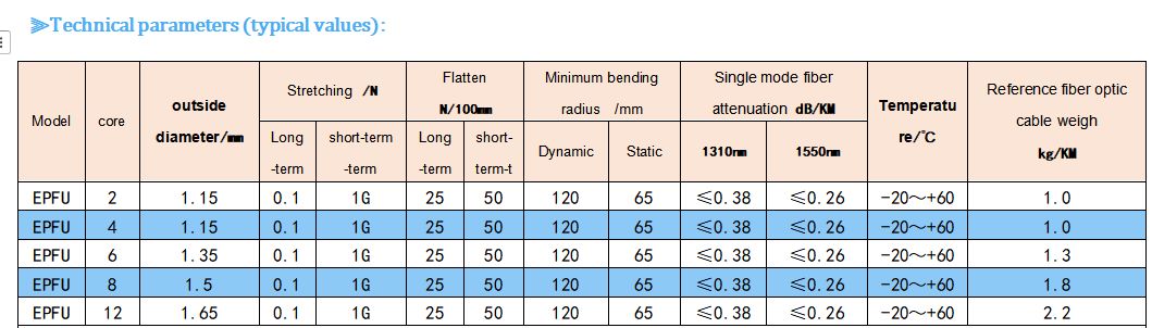 A estrutura do cabo consiste em fibras monomodo ou multimodo (que podem conter fibras de preenchimento) bem organizadas, formando uma configuração regular.o feixe é posicionado centralmente e extrudido com uma bainha de polietileno de alta densidade.